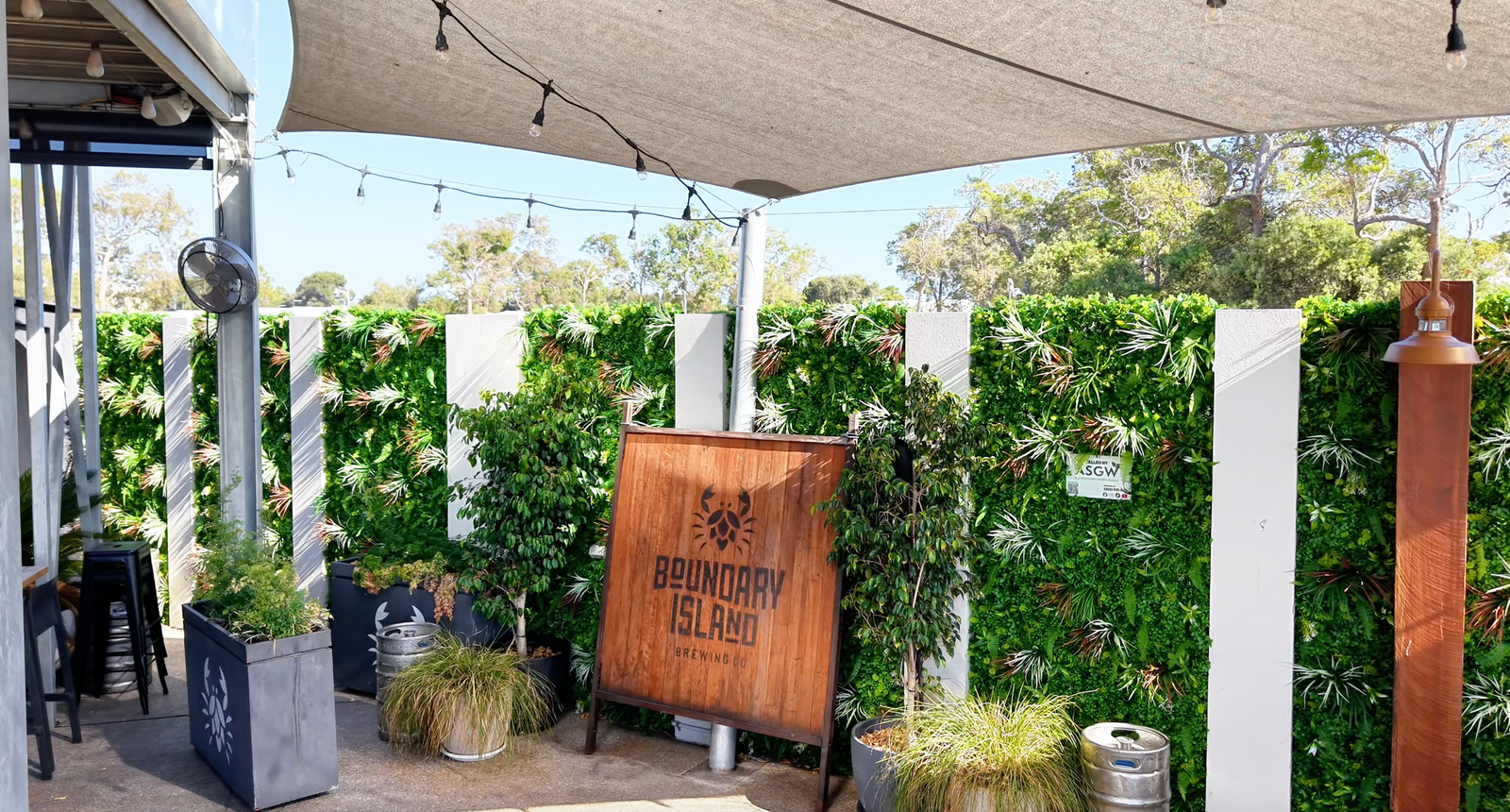 A recent installation of ours at Boundary Island Brewing Co. Our team installed the Tropical green wall, which transformed this wall in their outdoor area, providing a vibrant, low-maintenance, lush escape.
